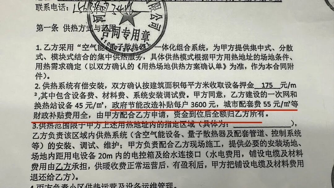 杨女士向记者展示了一份天河置业与中丹建业签订的供热协议复印件,协议显示:“政府节能改造补贴每户3600元,城市配套费55元/平方米等财政补贴费用,由甲方(天河置业)配合乙方(中丹建业)申请,资金到位后全额归乙方(中丹建业)所有。”