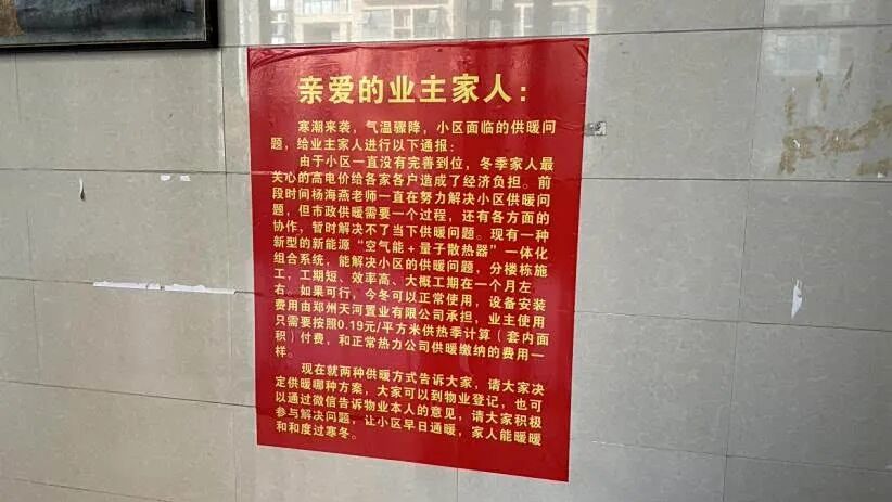 据业主杨女士回忆:“去年11月,他们开始在小区宣传‘空气能热泵+量子真空散热器’的供暖方式,仅一个月后就进场施工了。其间物业和施工方都未充分征询我们业主的意见。”