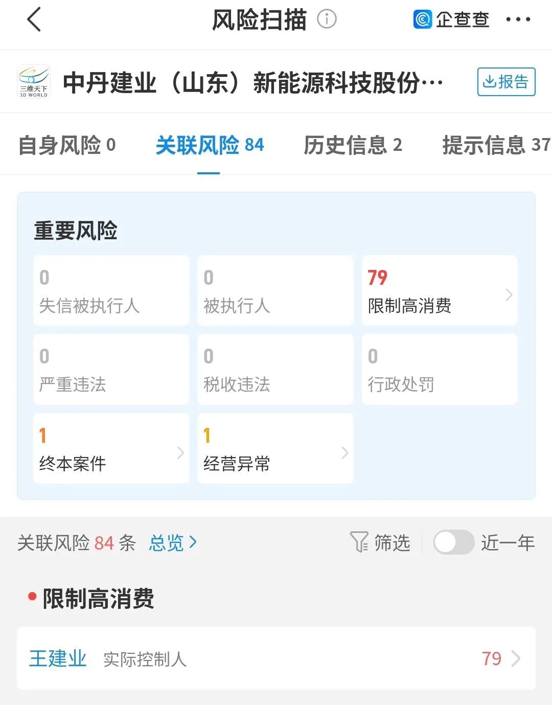 记者在企查查平台查询中丹建业企业信息发现,这家公司仍在存续期,但实际控制人王建业存在79条限高风险信息。